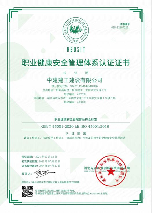 職業健康安全管理體系認證證書